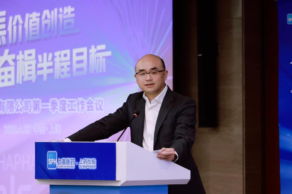 上藥控股戰(zhàn)略創(chuàng)新部總經(jīng)理黃文爭作《一季度重點工作進展》報告