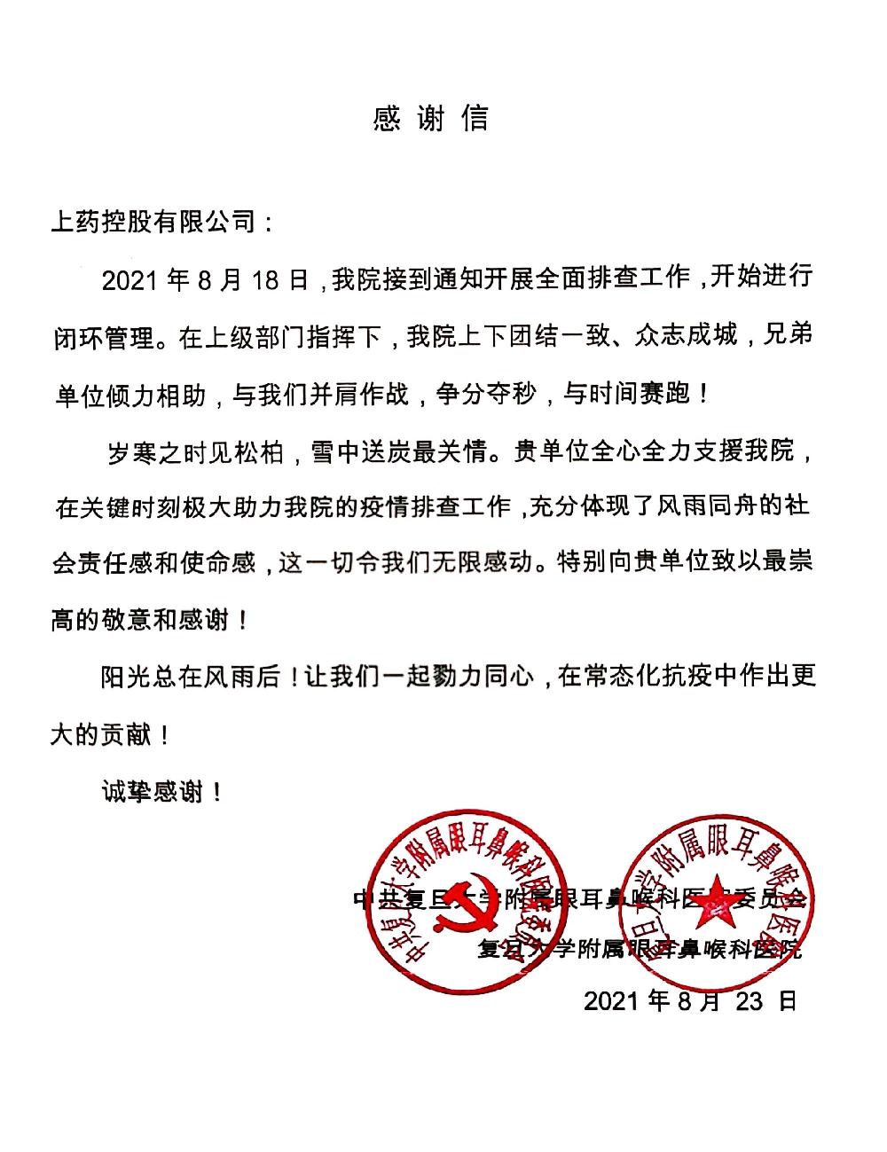 8月19日,眼耳鼻喉科醫(yī)院通過(guò)對(duì)口服務(wù)的銷售代表向上藥控股傳達(dá)了用藥的需求。接到通知后,上藥控股快速響應(yīng)、積極行動(dòng),上藥控股全國(guó)運(yùn)營(yíng)管理中心協(xié)同上藥物流、上海業(yè)務(wù)總部等各相關(guān)部門(mén)及時(shí)啟動(dòng)緊急預(yù)案,從開(kāi)單、配送、與醫(yī)院交接,所有流程加快作業(yè),開(kāi)辟綠色通道。事后,復(fù)旦大學(xué)附屬眼耳鼻喉科醫(yī)院寄來(lái)了感謝信,對(duì)上藥控股在關(guān)鍵時(shí)刻出色完成藥品保供任務(wù),全力支持醫(yī)院的疫情排查工作表達(dá)了敬意和感謝。