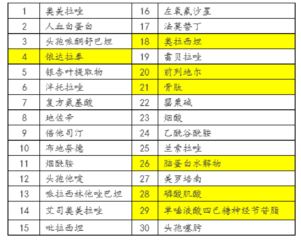 第二批目錄較第一批,數(shù)量由20個(gè)調(diào)整為30個(gè)品種,有7個(gè)品種繼續(xù)留在監(jiān)控目錄中(黃色背景所示)。第二批新增的23個(gè)品種中,共有6個(gè)抗生素、5個(gè)質(zhì)子泵抑制劑、另地佐辛、人血白蛋白也納入進(jìn)來。