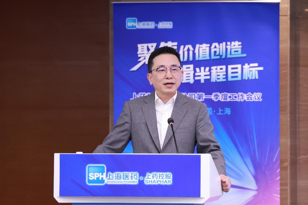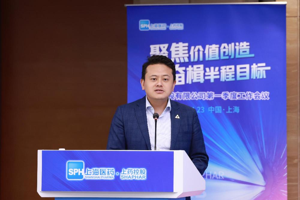上藥控股戰(zhàn)略創(chuàng)新部總經(jīng)理黃文爭作《一季度重點工作進展》報告