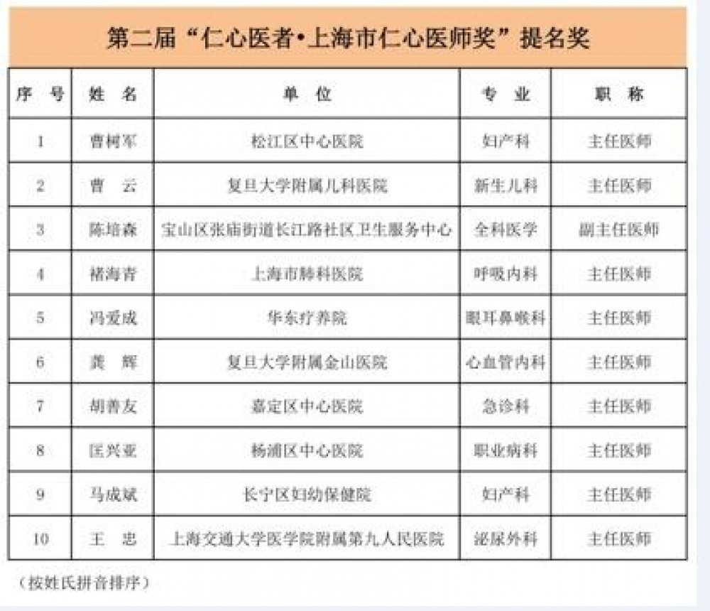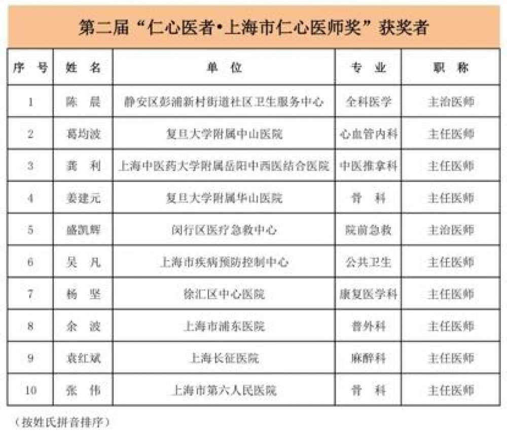 本次評選活動由上海市衛(wèi)生和計劃生育委員會指導,上海市醫(yī)師協(xié)會、上海市浦東新區(qū)廣播電視臺共同主辦,上藥控股有限公司獨家支持,于2017年2月啟動、5月舉辦了初審活動。本屆獲獎醫(yī)師名單如下: